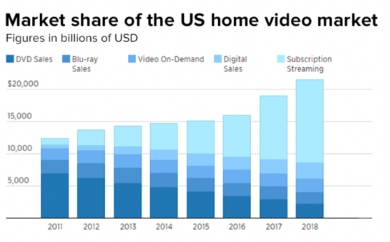 A graph depicting the diminishing market share of DVD sales and increasing use of streaming subscriptions from 2011 to 2018. sourced from https://www.cnbc.com/2019/11/08/the-death-of-the-dvd-why-sales-dropped-more-than-86percent-in-13-years.html