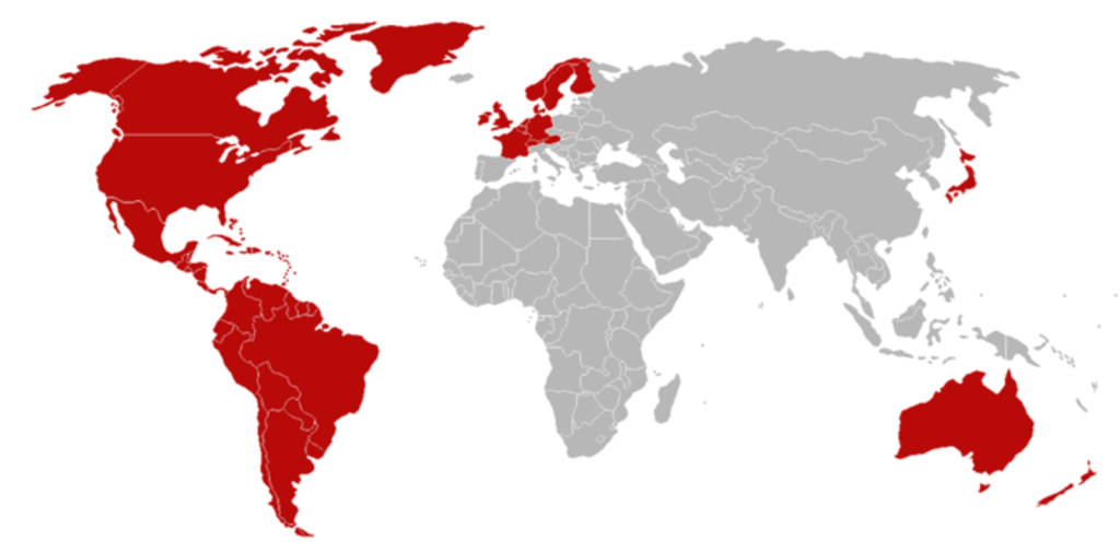 Map depicted where Netflix is currently available sourced from http://netflix-abroad.com/